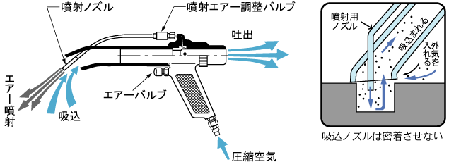 Wonder Gun深孔,型是Wonder Gun W1o1W301 系列的機(jī)械加工品,附有射嘴和吸嘴。以正鏡究(壓病空氣)為動力源,邊吹邊吸,是種獨持的可用于清洗有底孔和清除異物的氣槍,非常適合攻絲作業(yè)等后處理,可以調(diào)整空氣噴射。當(dāng)您按下空氣閥時,空氣從噴射噴嘴的尖端噴射。在噴氣的同時產(chǎn)生吸力,徹底清除深孔內(nèi)部的切削粉塵。請勿緊密接觸吸嘴,以免外部空氣進(jìn)入。對于小孔,取下噴嘴的尖端并安裝小孔用噴嘴(另售)。細(xì)孔用噴嘴外徑有1.3mm、1.8mm、2.2mm。 無法安裝到 W101-II 系列。