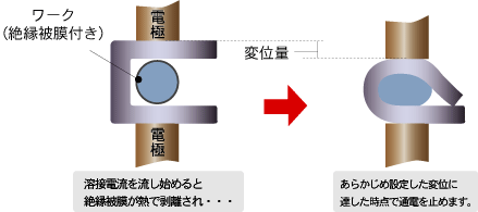 電極位移(熔深)預(yù)先通過焊接檢測器(帶位移監(jiān)測功能)設(shè)定。當(dāng)位移量達(dá)到設(shè)定值時(shí),輸出中斷信號并停止電流,從而實(shí)現(xiàn)以穩(wěn)定的位移量進(jìn)行熔合。