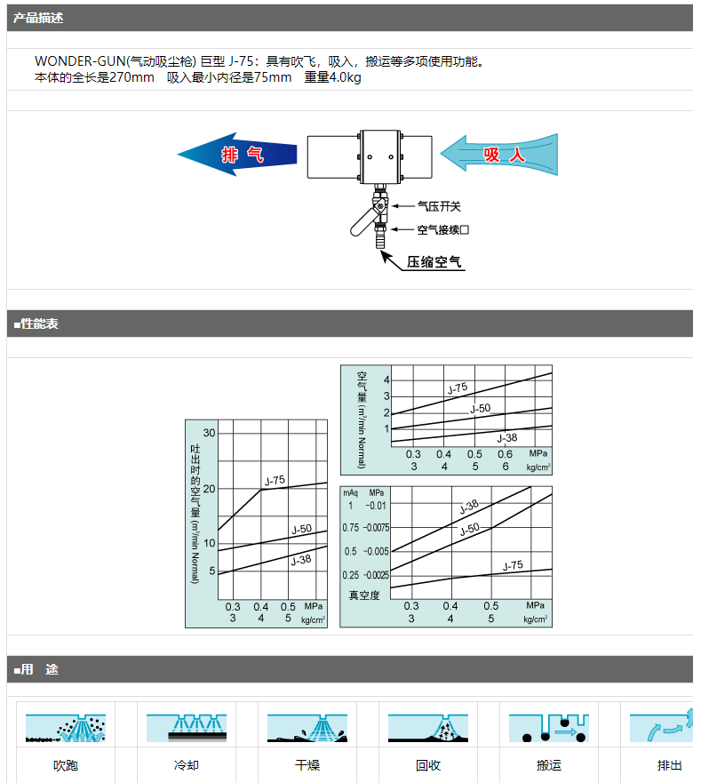 產(chǎn)品簡介: WONDER-GUN(氣動吸塵槍) 巨型 J-75:具有吹飛,吸入,搬運等多項使用功能。 本體的全長是270mm 吸入最小內(nèi)徑是75mm 重量4.0kg