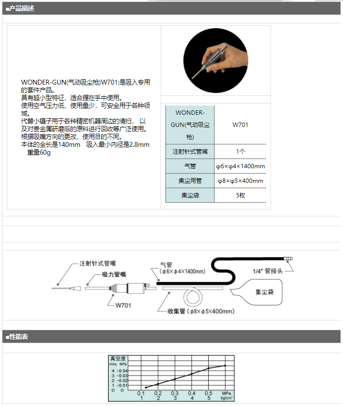 產(chǎn)品簡介: WONDER-GUN(氣動吸塵槍)W701:是吸入專用的套件產(chǎn)品。 具有超小型特征,適合握在手中使用。 使用空氣壓力低,使用量少,可安全用于各種領域。