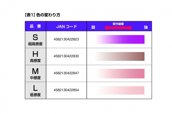 當(dāng)接收紫外線時(shí),它可以從無(wú)色變色,并且可以通過顏色變化確認(rèn)UV照射。變色是不可逆的,一旦變色就不會(huì)恢復(fù)。