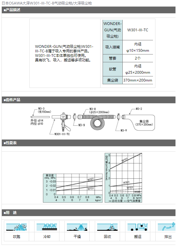日本OSAWA大澤W301-III-TC-B氣動吸塵槍