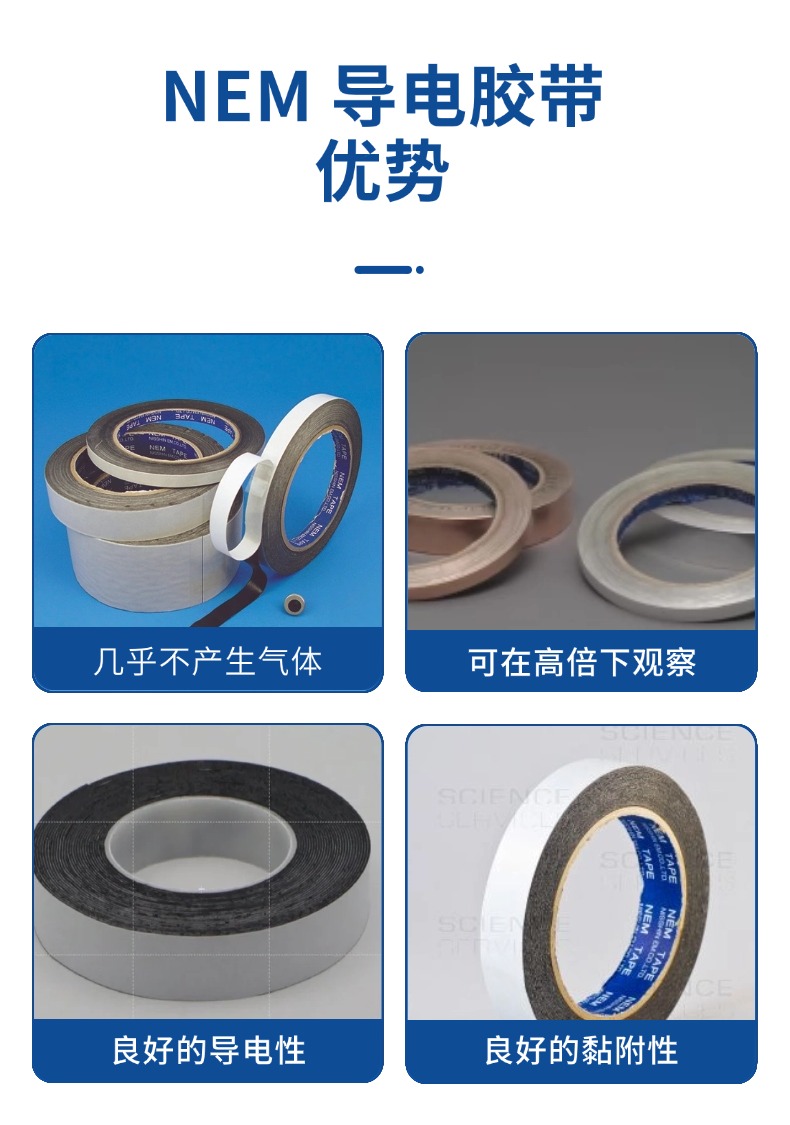 用于密封EMI屏蔽室,殼體和電子設(shè)備的接縫,纏繞電纜進(jìn)行屏蔽,提供可靠的接地表面,對(duì)不能焊接的表面提供電接觸,日新雙面碳導(dǎo)電膠帶是專(zhuān)門(mén)為掃描電鏡具有良好的黏附性和不可辨結(jié)構(gòu),是觀測(cè)整個(gè)樣本的理想背景基片。