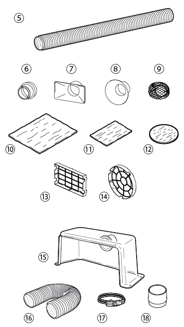 主機(jī), 電源線, 搖控器, 圓蓋, 前過(guò)濾片L (10塊), 主過(guò)濾片L, 使用說(shuō)明書(shū)