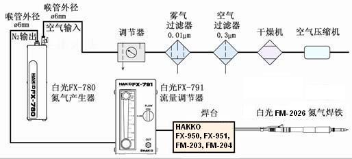 | (1) 白光 *(FX950 / FX951 / FM203 / FM204) + (2) 白光 FM2026 氮?dú)夂歌F + (3) 白光 *FX780 氮?dú)猱a(chǎn)生器 + (4) 白光 *FX791 氮?dú)饬髁空{(diào)節(jié)器 之氮?dú)庀到y(tǒng)組合。 | ![]() |
