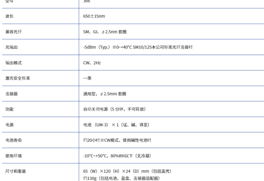 可見光源重視安全性的激光等級(jí)1光輸出進(jìn)一步,通過低輸出光規(guī)格減輕傳輸裝置的負(fù)擔(dān)通用適配器對(duì)應(yīng)所有光連接器φ2.5mm ○可視光源的到達(dá)距離為約1km的短距離確認(rèn)用的理想選擇輕巧緊湊(名片尺寸)1 節(jié) AA 干電池可長(zhǎng)時(shí)間連續(xù)運(yùn)行世界上小、輕(Mini 系列通用)