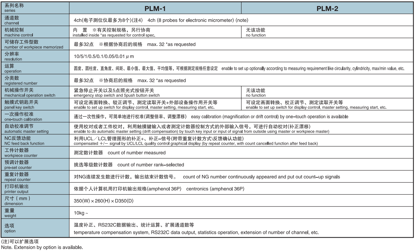 PLM,備有機(jī)械順序控制器和機(jī)械操作板功能的PLM-1系列,以及不具有機(jī)械控制部分的PLM-2系列。每種系列的空氣·電氣測微儀,均可構(gòu)筑最大4通道(電氣測微儀的檢測儀最多8通道)的測定系統(tǒng)。 PLM-1系列,內(nèi)置操作板和機(jī)械控制JI困序控制器,該機(jī)型最適合用作自動(dòng)測定機(jī)的控制器。此外,顯示部分采用了8色顯示彩色LCD觸摸板,除了顯示測定值,還可用于判定的彩色顯示、條狀圖表、管理圈圈表顯示等,可同時(shí)提高視覺辨認(rèn)度和操作性。