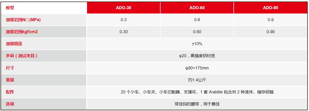 模型ADO-30ADO-60ADO-90測量范圍N/?(MPa)0-30-60-9測量范圍kgf/cm20-300-600-90測量精度±10%多莉(測試夾具)φ20,高強度鋁材質(zhì)尺寸φ90×175mm重量約1.4公斤配件20 個小車、小車夾、小車切割器、支撐環(huán)、1 套 Araldite 粘合劑 2 種液體、儲存鋁箱