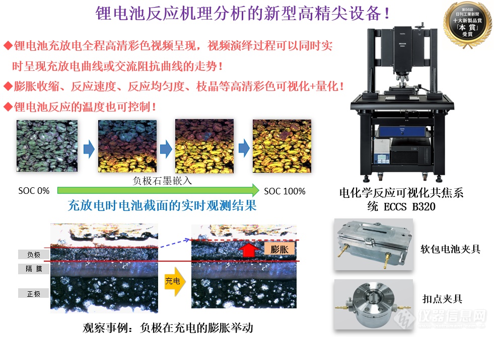產品簡介: 鋰電池反應機理分析的新型高精尖訪 鋰電池充放電全程高清彩色視頻呈現,視頻演繹過程可以同時實時呈現充放電曲線或交流阻抗曲線的走勢! 膨脹收縮、反應速度、反應均勻度、枝晶等高清彩色可視化+量化!鋰電池反應的溫度也可控制!